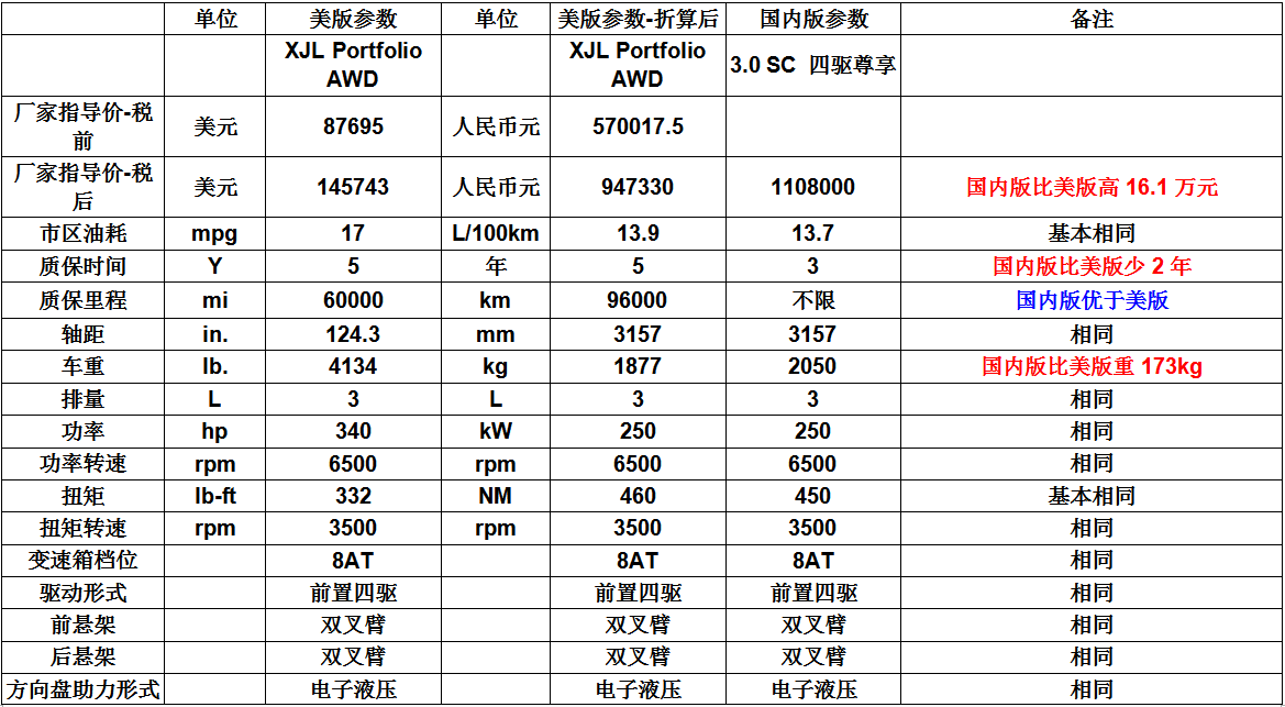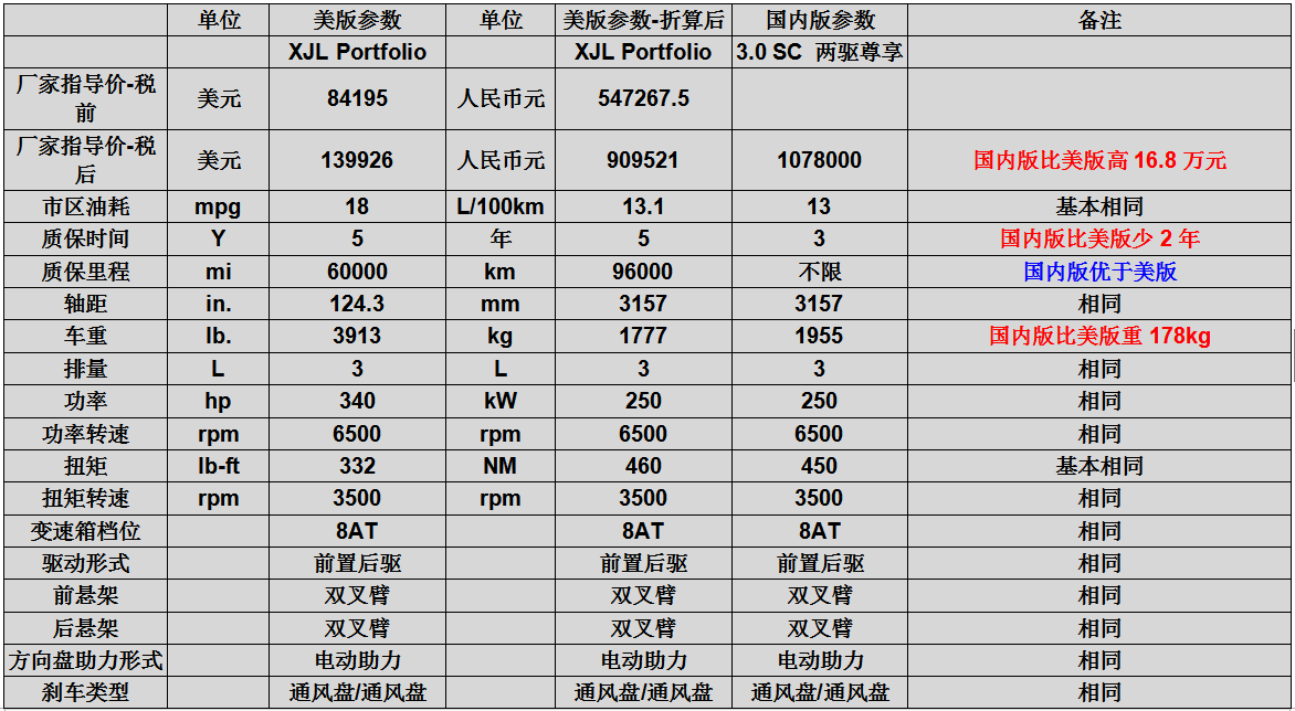 美版XJL Portfolio型与国内3.0 SC 两驱尊享型参数对比见下表: