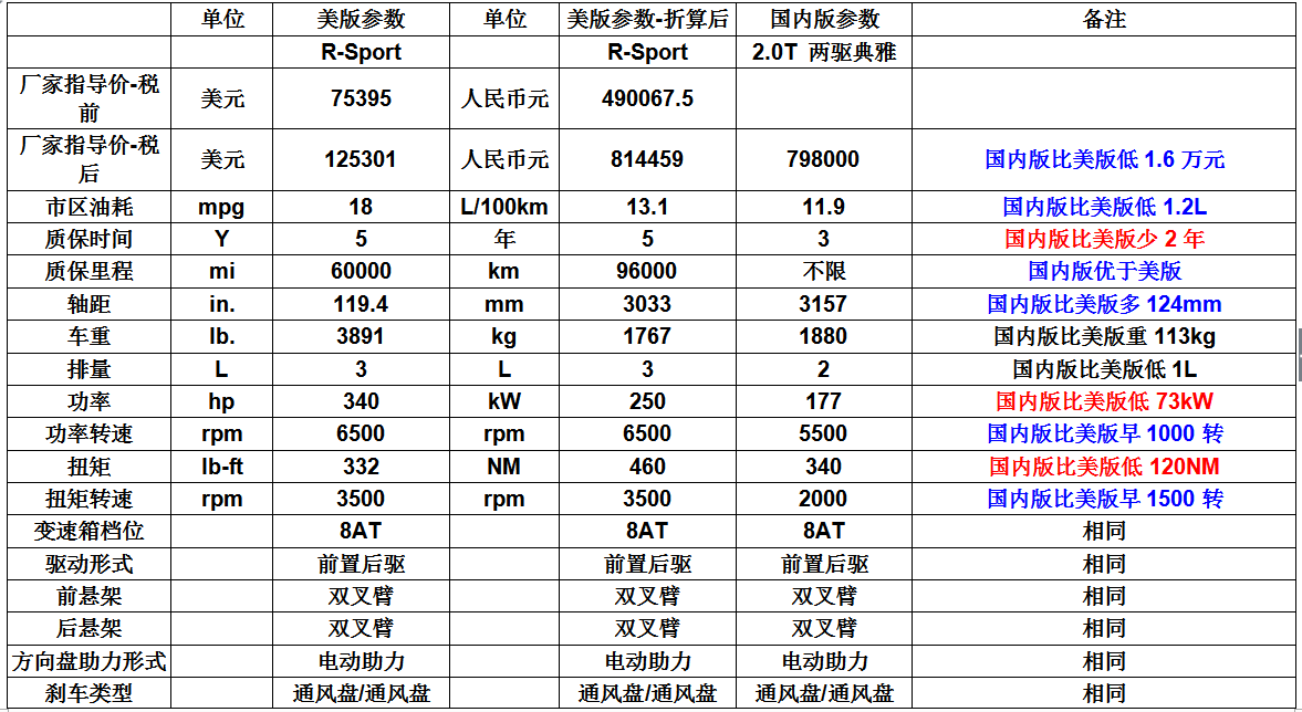 美版R-Sport型与2.0T 两驱典雅型参数对比见下表: