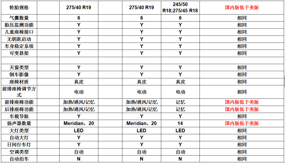 4. 国内版动力系统低于美版。国内版采用了2.0T和3.0T两款发动机。其中,2.0T发动机的油耗优于美版,但是功率和扭矩也低于美版。3.0T发动机的与美版相同。由于国内汽车消费税的影响,国内版没有采用5.0T发动机,在笔者看来,这是适合中国政策的合理调整。
