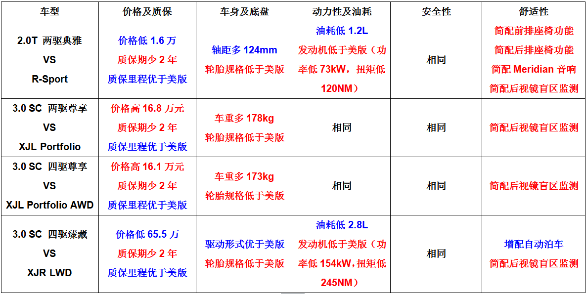 美版XJL Portfolio AWD型与3.0 SC 四驱尊享型参数对比见下表: