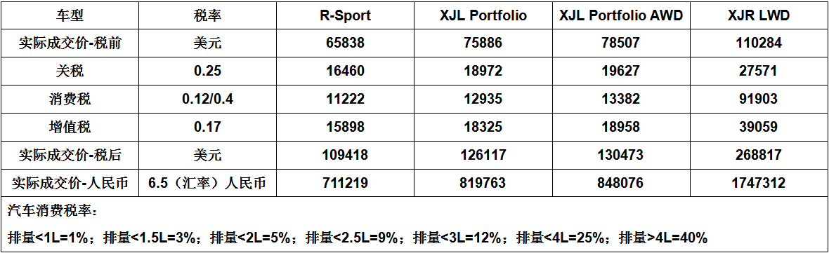 本文中,美版车型“税后价格”,指的是“美版车型厂家指导价+国内关税+国内汽车消费税+国内增值税”(不包括购置税)。如此计算的原因在于:美版车型厂家指导价,已经包括“生产生利润”、“经销商利润”这两块。国内厂家指导价,则包括“生产生利润”、“经销商利润”、“国内税费”这三块。两者相比,国内多了“国内税费”这一块。考虑到“国内税费”是硬成本,不会成为经销商的利润,因此,本系列文章中,所有的美版车型价格,都增加了国内的税费。