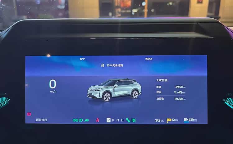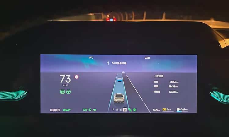 测试的第一天,先用纯电模式行驶,当续航只有18km时,电量显示为黄色,同进系统自动开启「超级增程」模式,发动机作为发电机开始工作。这时需要你把驾驶模式从「超级增程」手动变成「纯电」,这样仍然可以当纯电车行驶。