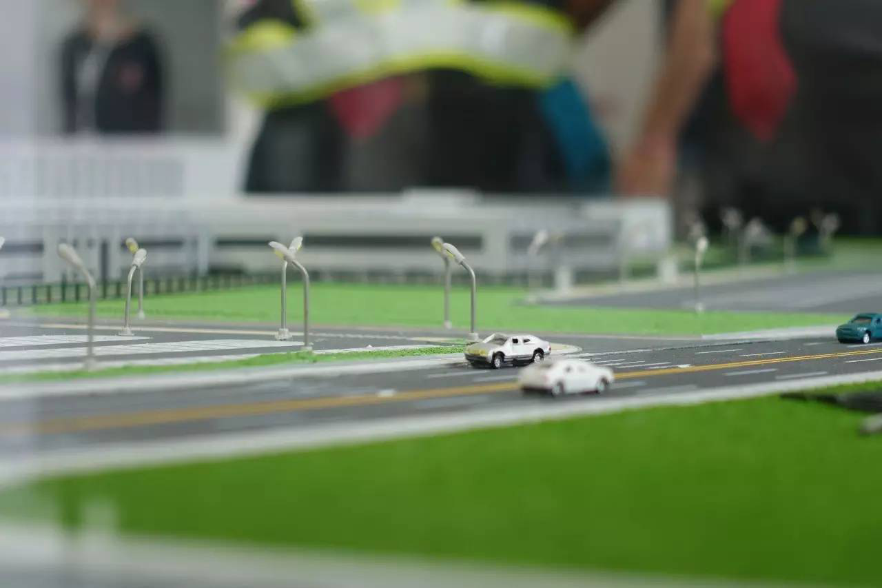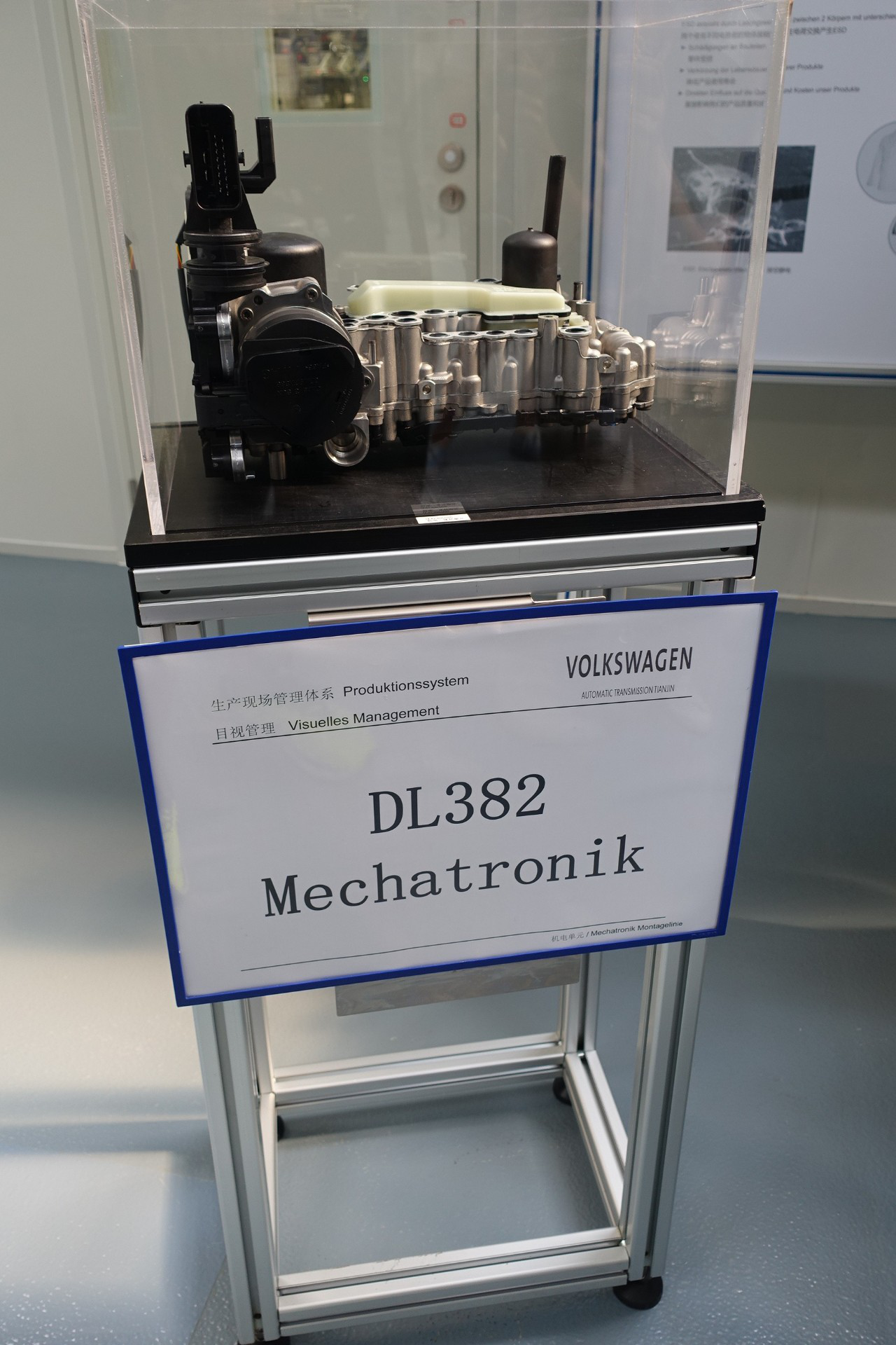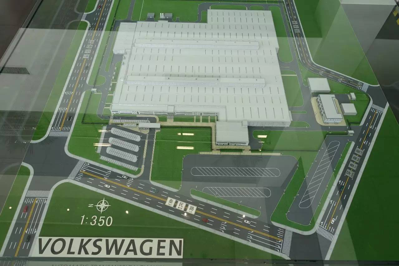 在展示板的左手边有一个玻璃柜,里面放置着大众汽车自动变速器(天津)工厂的沙盘模型。白色的厂房,大面积“植被覆盖”,还有各种小车模,就是做工有待提升好嘛。