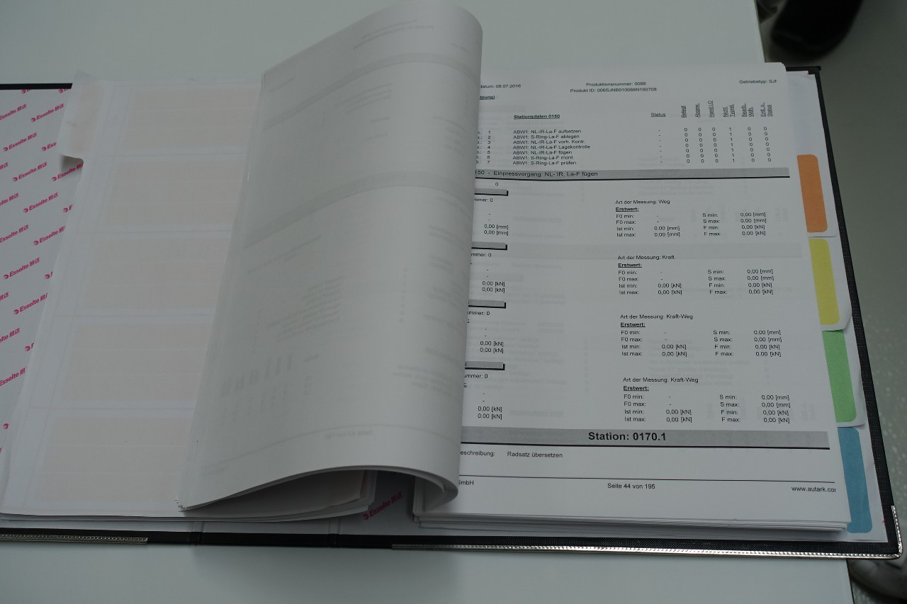 值得一提的是,每一个变速器都有260页A4纸的生产记录,分别记录着加工日期、加工时间,甚至连74个压装数值和128个拧紧数据也都被“收入囊中”。