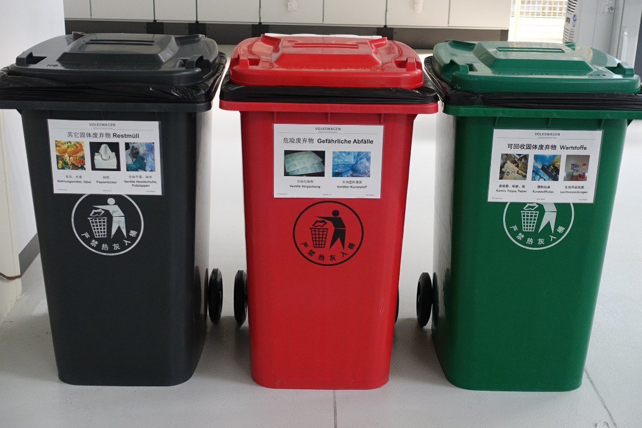 在前往下一个模块生产区的路上,小主偶然发现工厂内的垃圾箱被分为三个类别:其他固体废弃物、危险废弃物以及可回收废弃物,并以黑、红、绿区分开来。