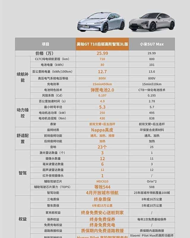 针对这两款显著地展示了智能驾驶进步的车型,本研究将专注于对昊铂GT710后驱高阶智驾3L版和小米SU7Max进行一次详尽的比较评估。