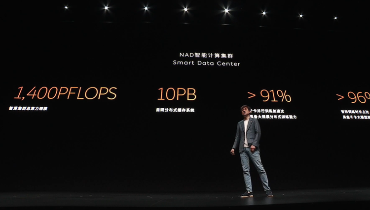 所以,它不是传统意义上的「人工智能大模型训练」,实际上的 NAD 中央智能计算集群,算力是 1400P,约合 1.4E(算力精度未公布)。