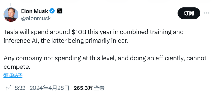 这场算力大赛,在 4 月 28 日被马斯克直接拉到天花板。他在 X 上说,「特斯拉今年大概会投资 100 亿美元,用于训练和推理结合的人工智能,后者主要用于汽车。任何没有这种规模投入的企业,并且高效推进,没法玩(cannot compete)」。