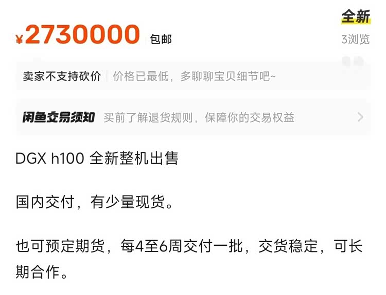补充一个背景知识,其实现在 DGX H100 国内都可以买到,大家作为个人都能买,只是需要经过代理,而不是直接一个电话打给老黄。闲鱼渠道显示,一台 DGX H100 的报价在 250 万元以上。