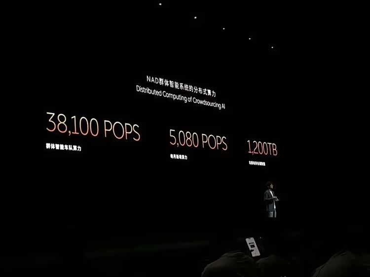 先说蔚来吧,去年 9 月份的 NIO IN 全栈技术发布会上,任少卿晒出了这样一张 PPT:38100POPS 的「群体智能车队算力」,约合 38E,看起来相当炸裂(INT8 精度)。