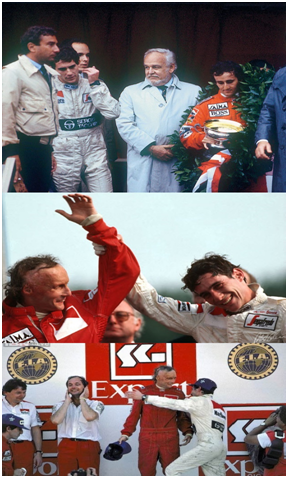 左图:塞纳与普罗斯特获得奖杯 右图:比赛被停止后,塞纳举手庆祝