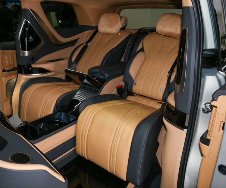 车内搭载12.3英寸液晶仪表、12.3英寸中控屏、12.3英寸副驾娱乐屏组成的三联贯穿屏,中间隔断配备可升降智能屏及水杯架,后排为2张独立航空座椅,座椅前方设置智控扶手屏,方便后排乘客调节座椅。新车可针对用户需求对地板材质及星空顶进行定制。