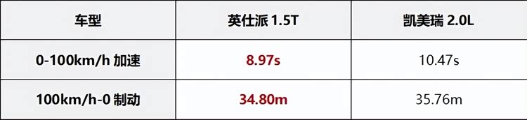 动力方面,我们以纯燃油版车型进行对比。英仕派搭载的1.5T发动机最大功率141kW(192Ps),最大扭矩260N·m,匹配CVT无级变速箱。凯美瑞搭载的2.0L自然吸气发动机最大功率127kW(173Ps),最大扭矩206N·m,同样匹配的是CVT无级变速箱。我们对两台车的零百加速和百公里紧急制动进行了测试,两车均关闭空调和牵引力控制,英仕派关闭ECON模式,变速箱切换到S挡,凯美瑞打开运动模式。英仕派0-100km/h加速时间8.97秒,凯美瑞零百加速时间10.47秒。100km/h-0紧急制动,英仕派制动距离34.80米,凯美瑞制动距离35.76米。从测试成绩能够看出,英仕派在零百加速上比凯美瑞更有优势,1.5T发动机的动力储备明显比2.0L自吸发动机更充足。此外,英仕派配备的轮胎尺寸是235/45 R18,而凯美瑞的轮胎尺寸是215/55 R17,不仅尺寸更大,胎宽也要比凯美瑞更宽一些,既能有较好的轮胎抓地力,同时也能够缩短紧急制动的距离。