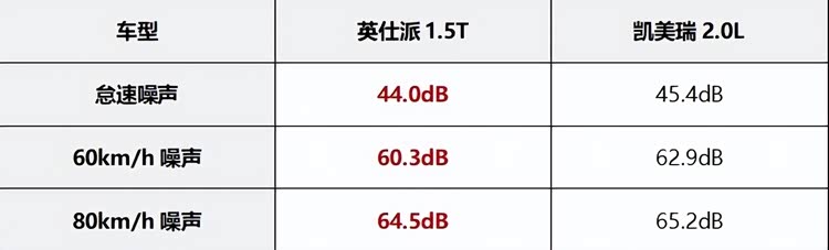 我们还对两台车的油耗以及噪音进行了测试,先来说油耗,两台车空调温度均调到25℃,风量为2档。英仕派打开ECON模式,凯美瑞打开经济模式。两台车的油箱均加满至跳枪,行驶道路包括城区和高速路,行驶约100km返回加油站,油箱再次加满至跳枪。测试成绩如下,英仕派实际油耗只比凯美瑞高出0.11L,结合1.5T发动机的功率扭矩参数,再加上英仕派比凯美瑞多跑了6.8km,更快的平均车速,显然这样的油耗并不高。新款凯美瑞的全车窗玻璃是双层隔音结构,而英仕派有多项NVH优化措施。对两款车型分别进行了怠速、60km/h、80km/h车内噪音数据收集,结果显示英仕派车内环境比凯美瑞更静谧。
