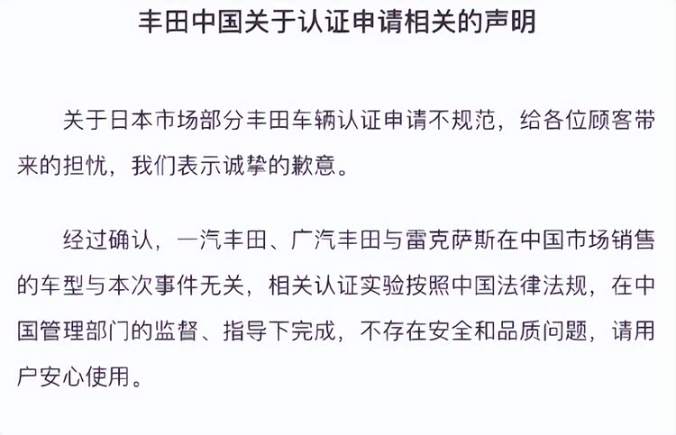 6月3日当天,丰田中国发布声明,表示一汽丰田、广汽丰田和雷克萨斯在中国市场销售的车型与本次事件无关。