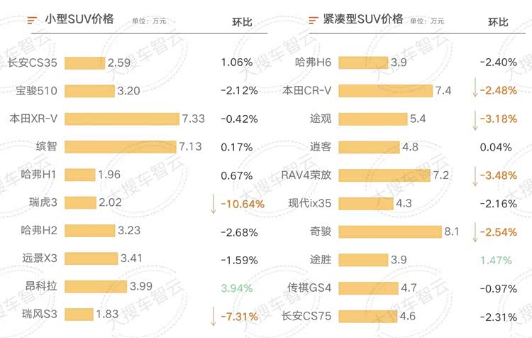 - 紧凑型SUV:本田CR-V、途观、RAV4荣放、奇骏平均成交价纷纷跌至历史低位,环比下降1800-2600元,降幅高于其他热销紧凑型SUV。