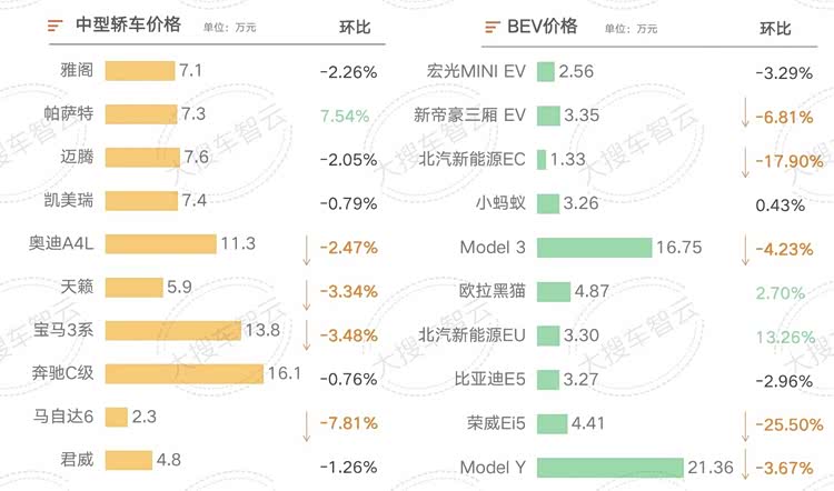 - 中型轿车:奥迪A4L、天籁、宝马3系平均成交价环比分别下降2900元、2100元、5000元,而帕萨特平均成交价环比上涨5100元。