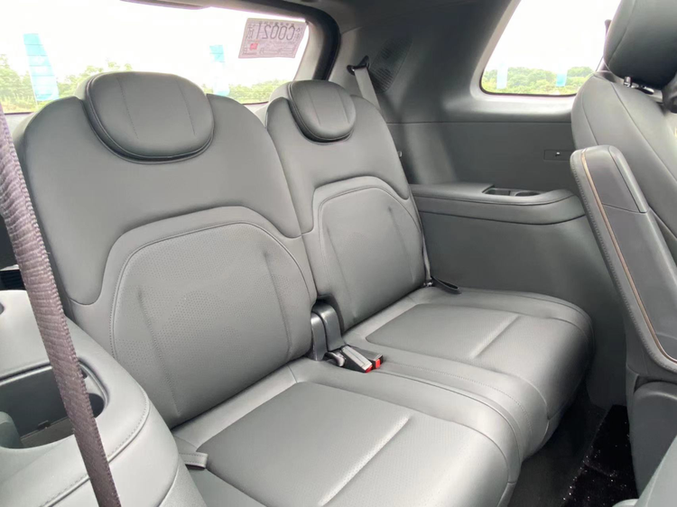 最后是空间表现,eπ008算是同级别比较领先的,前排调整到适合坐姿之后,第三排腿部还有一拳多的空间余量,头部也有4指左右的余量,这样的表现和理想L8相比也丝毫不输,不过座椅承托方面的表现就比较一般,基本和其他6座SUV类似,没能达到领先水平。