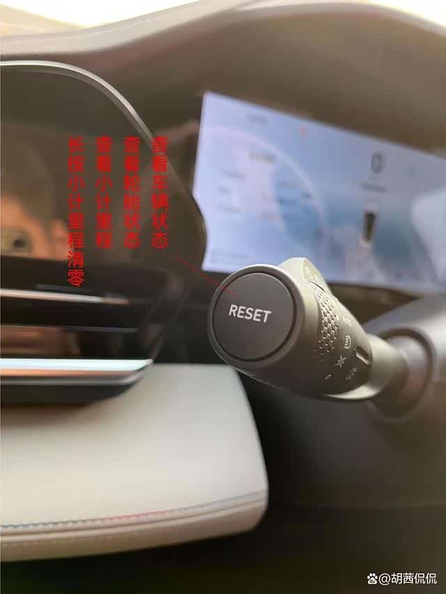 左边拨杆顶端还有一个按键,这个按键主要是切换仪表盘内容显示的。可以查看车辆里程、状态、胎压等。长按可以重置数据。