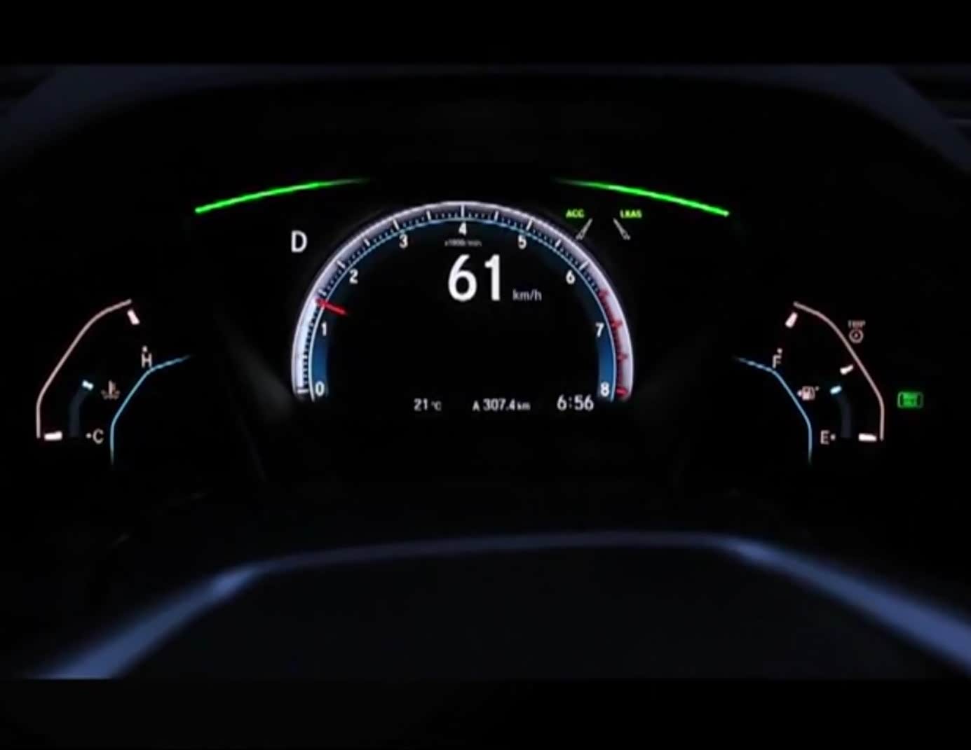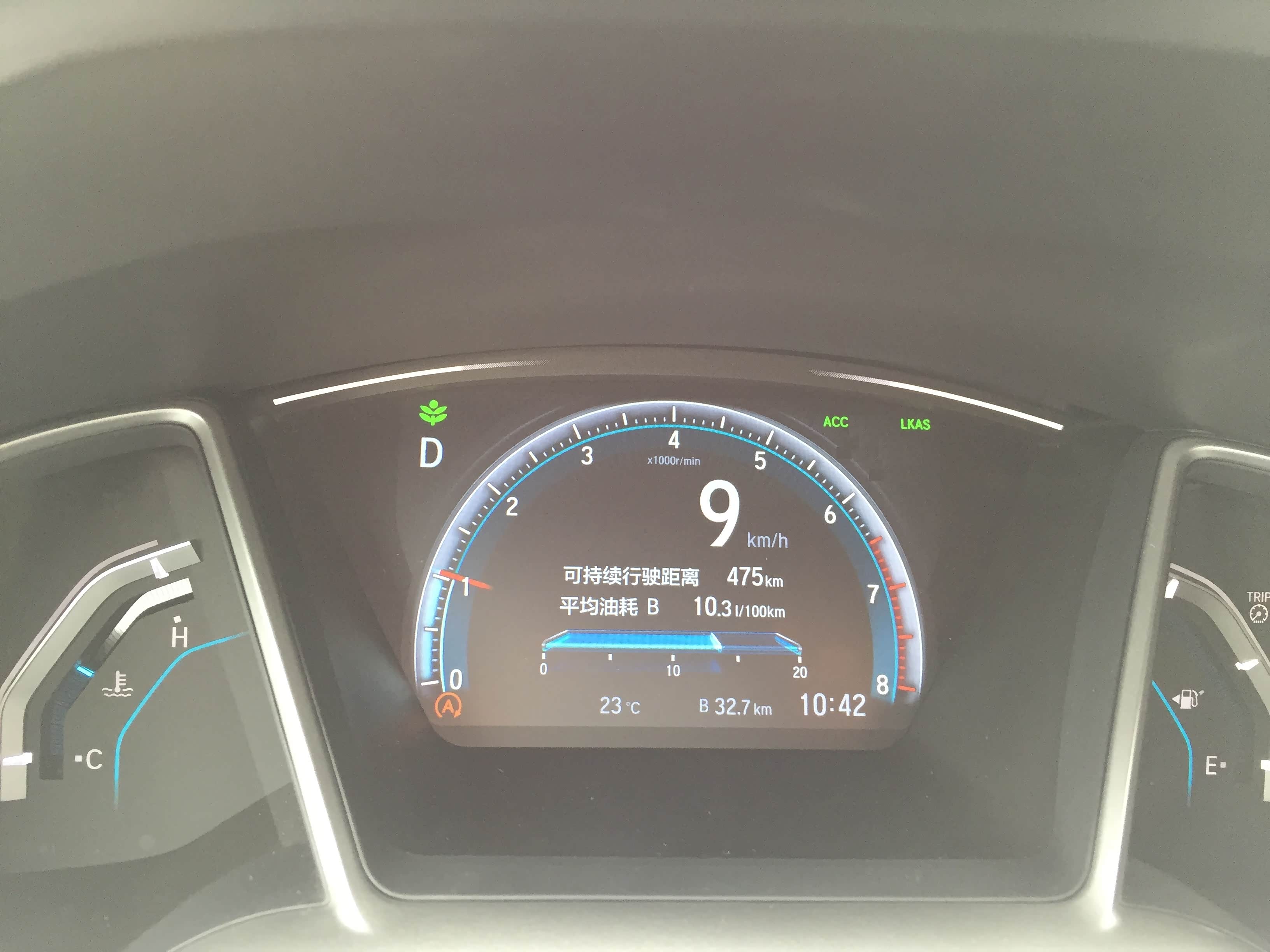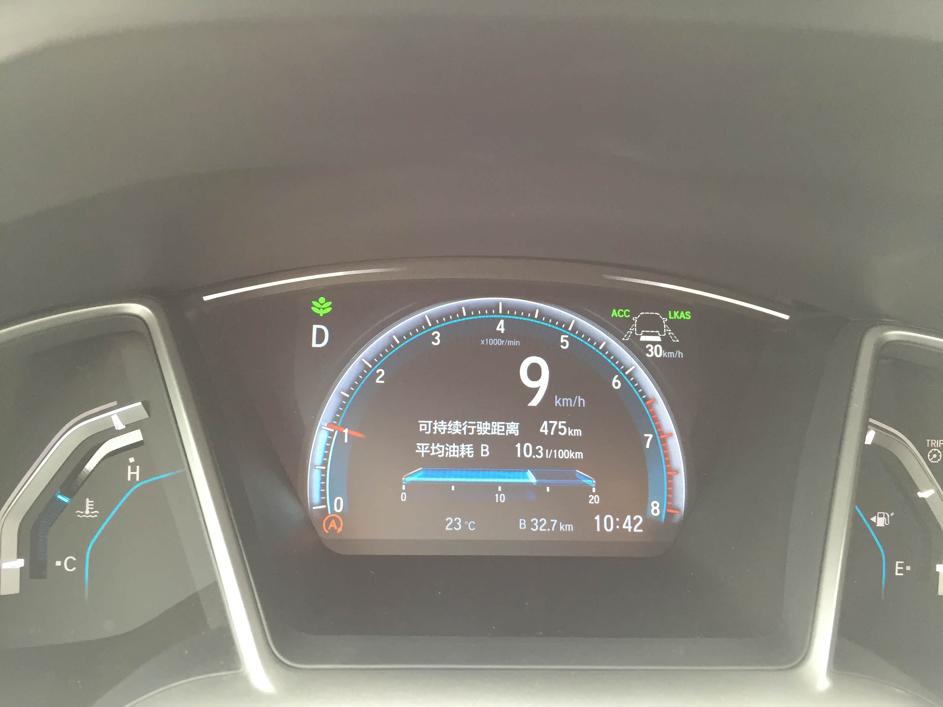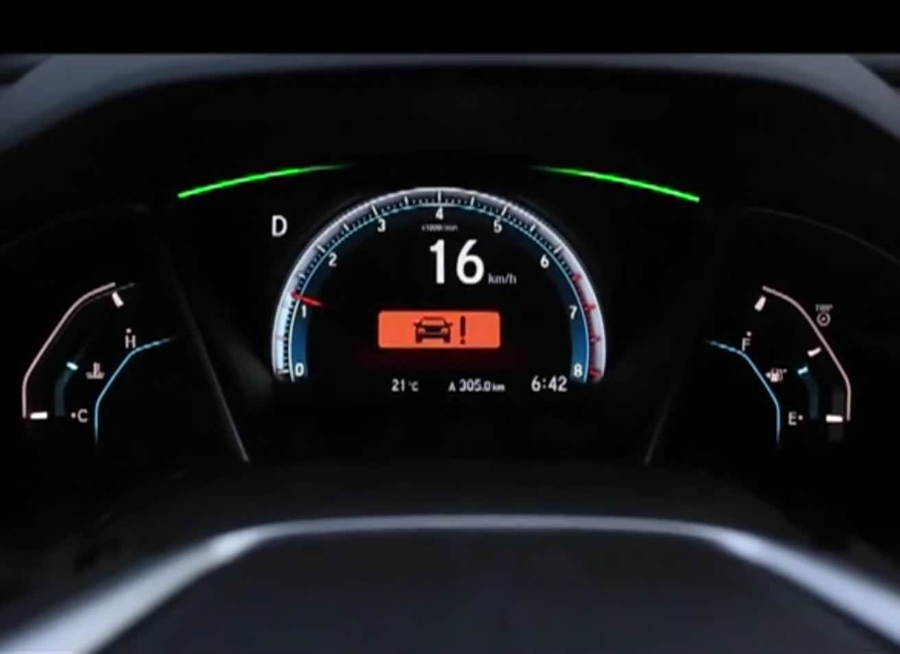 这个功能是在定速巡航的基础上加上各种雷达和摄像头辅助装备来实现的自动跟车,它是定速巡航的进化版。这个功能现在基本上也都是新上市的车高配的标准配置了,思域的这个又有它自身的一些特点:有很多车是车速达到一定速度才可以开启,但是思域可以自动加速到最低30KM/H的定速时速。当档位挂到D档,解除电子刹车并按下方向盘右功能区的“SET-”键,车子会采用低油耗的模式自动加速到标定速度,这对于我连油门都不想踩的懒癌患者来说真是再适合不过了。