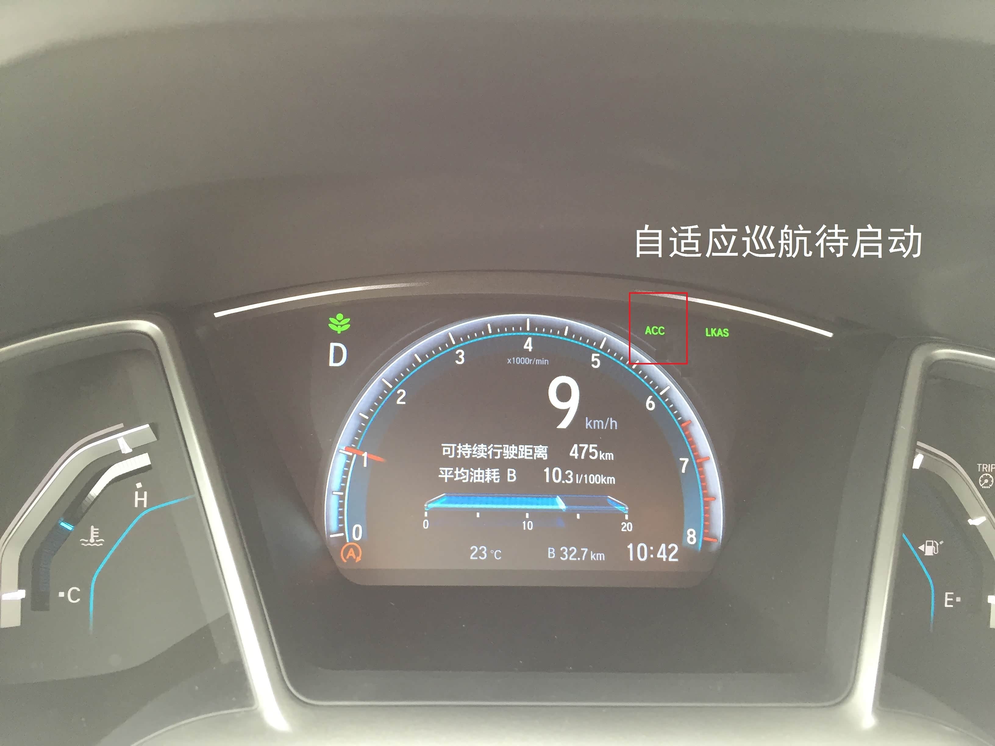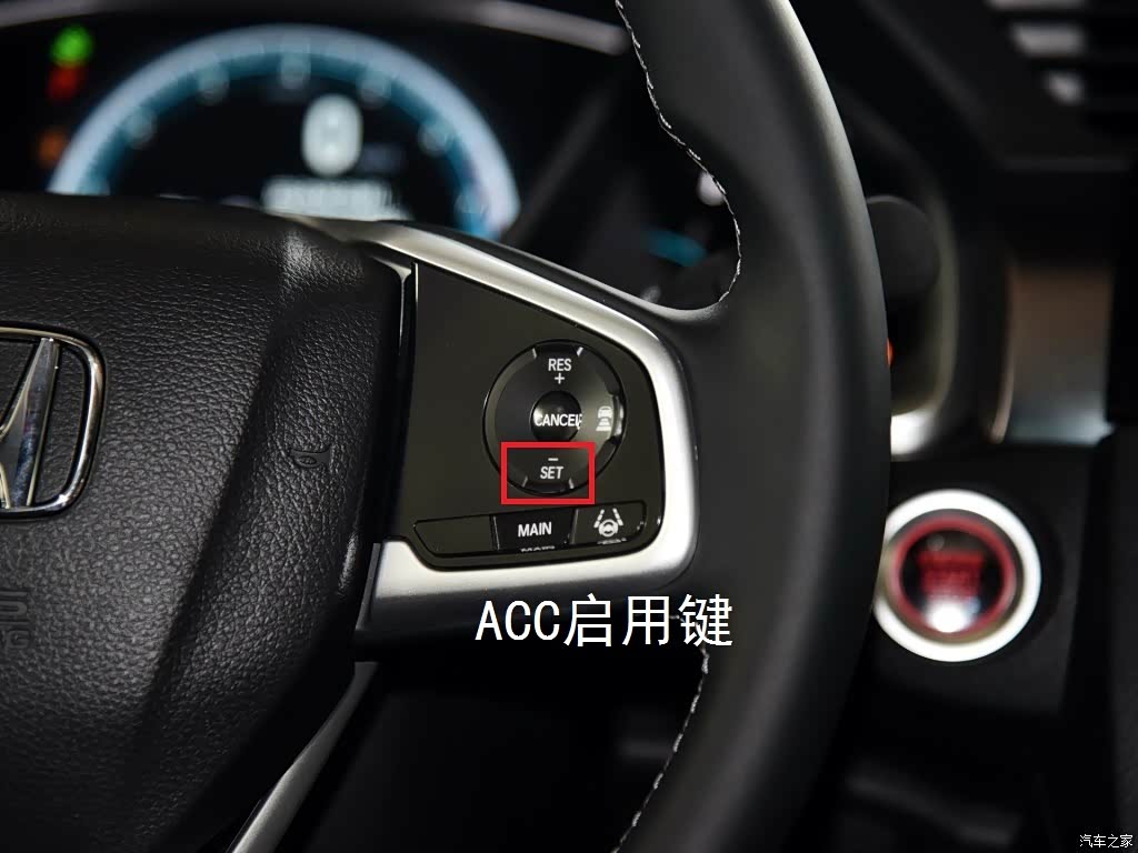 第五项是自适应巡航,跟打开车道保持的按键一样按下“MAIN”键,主液晶仪表右上方显示绿色ACC字母。