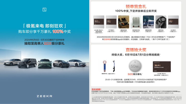 说到极氪001,这车的购车权益也是挺让人心动的。这不,6月购车权益加码了!在6月6日到6月30日这期间,下定并锁单极氪001的朋友,都有机会参与盲盒抽奖,奖品可是相当丰富啊。当然啦,就算运气一般,也有保底奖励,那就是600度电卡,等于直接省了840元,这可是实打实的优惠,绝对不吃亏。而且,除了这个盲盒抽奖,还有直播间抽奖,奖品更是豪华到不行,戴森两件套、50万极分豪礼都在等着你!所以,想要换车的朋友,可得抓住这个机会啊。不过啊,咱们也得理智点,根据自己的需求和预算来选择,别被这些优惠冲昏了头脑。