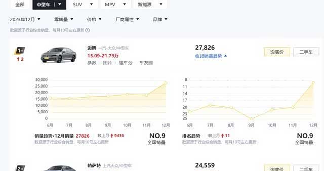 俗话说“三年风雨三年晴,谁行谁开380”,销量数据显示,迈腾在12月份中型轿车排行榜中以27826辆的成绩排名第一。这足以看出迈腾在国内传统合资B级车中绝对的统治地位。