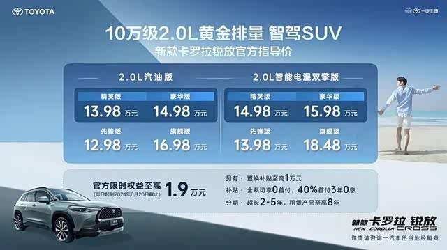 2024款一汽丰田卡罗拉锐放提供8款配置车型,分别为:2.0L CVT 先锋版、2.0L CVT 精英版、2.0L CVT 豪华版、2.0L CVT 旗舰版、2.0L 智能电混双擎 先锋版、2.0L 智能电混双擎 精英版、2.0L 智能电混双擎 豪华版、2.0L 智能电混双擎 旗舰版,售价12.98-18.48万元。