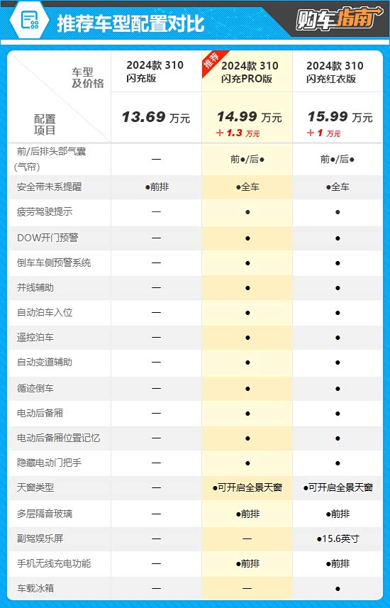 顶配车型310闪充红衣版在推荐车型的价格基础上增加了1万元,不过配置上仅增加了15.6英寸副驾娱乐屏和车载冰箱两项配置,并非刚需,没有必要为此增加购车成本。