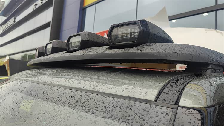 车顶和行李架贯通的四连探照灯组,可以说是全车的点睛之笔了。根据销售介绍,外侧的两个是远光灯,内侧的两个是户外场景下的探照灯。