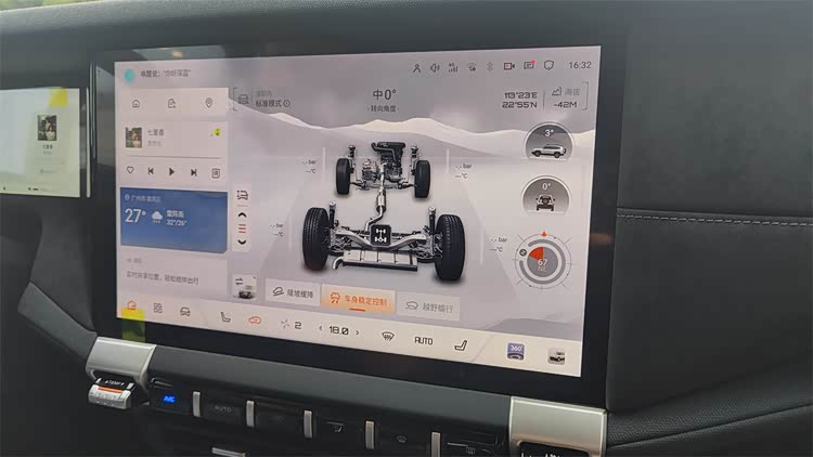 另外,由于这个顶配车型带有CDC减震和空簧,所以车身高度的调节,也连同驾驶模式、ESP开关、陡坡缓降、蠕行模式等越野场景相关的功能一起放在首页上了。