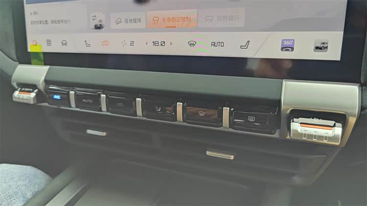 三幅式的方向盘尺寸不算太大,属于正常的家用车尺寸水平,而且环身的握感很光滑,至少也是高档的皮革面料材质包裹。挡杆的造型很别致,巨大的尺寸横跨了整个Console,能让人很舒服地把手搭在上面。后方则是留下了P挡、地形模式和差速锁的硬开关。中控屏的下方则保留了基础的空调控制区域。