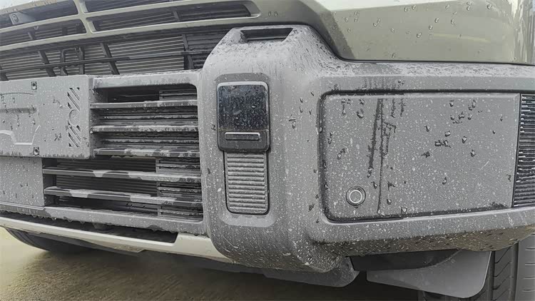 保险杠上的两侧,都带有一个很独特的矩形嵌套造型,当中还用了一小块亮面饰板,让我一开始还以为这家伙怎么带两个这么小的激光雷达……我感觉这部分造型,灵感可能是来自于自锁搭扣,给人一种前杠带有快拆功能的错觉。