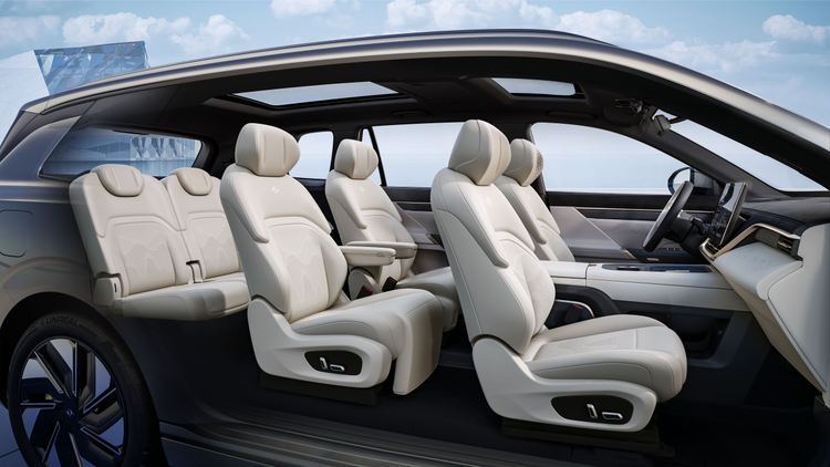 eπ008满足“536”家用大型SUV的黄金标准,即5米车长、3米轴距、真三排大六座布局,既能保证舒适的乘坐空间,更能在特殊情况下带来更高的第三排安全性。eπ008前排座椅标配电动调节和通风加热,主驾驶位还配有位置记忆、电动腰托等贴心功能。车内拥有180mm超宽后排过道,乘客可轻松出入二三排。第二排为公务舱式的大两座设计,均支持电动调节及通风加热,右侧提供零重力座椅,一键躺平,还带8点按摩,配合遮阳帘、小桌板等高级配置。此外,二排中央搭载同级唯一冷暖两用电动滑移冰箱,支持语音及触控电动滑移,使用更为方便。eπ008拥有同级罕见的第三排舒享空间,靠背到前排椅背距离700毫米,可媲美B级车第二排乘坐舒适度,独立杯架、阅读灯、充电口等便捷配置一应俱全。eπ008前挡和四门车窗均配备双层夹胶隔音玻璃,配合21英寸马牌全新一代EC7静音胎,打造静谧出行空间。