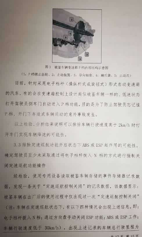 其后在4月27日,第三方鉴定机构给出鉴定结果一部分内容,在当时给出的鉴定结论中第三方检测相关人员给出的答案是:如果在不系安全带并且汽车的时速在20公里/小时以下的时候,开关车门的话汽车会先打到P挡,这个时候电子驻车系统启动能对刹车起到一个辅助作用