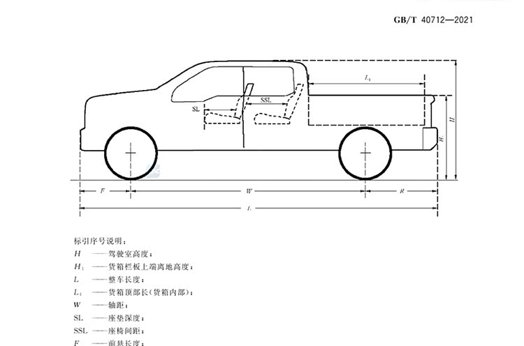 在刚刚提到的由公安部起草的《道路交通管理 机动车类型》(GA 802-2019)中,首次将“多用途货车”纳入了车辆结构的分类之中。所谓的“多用途货车”指的是“具有长头车身和驾驶室结构、核定乘坐人数小于或等于5人(含驾驶人)、驾驶室高度小于或等于2100mm、货箱栏板(货厢)上端离地高度小于或等于1500mm、最大设计总质量小于或等于3500kg。”的车型。而目前,车身长度小于6000mm且总质量小于4500kg的“轻型多用途货车”特指广义上的皮卡。而2022年05月01日实施的《多用途货车通用技术条件》(GB/T 40712-2021)则进一步细化并明确了双排座椅多用途货车的技术要求。这是一份由工信部提出,经中汽标委、公安部以及众多车企共同起草针对“多用途货车”的国家标准,为皮卡车型的发展起到了关键的推动性作用。