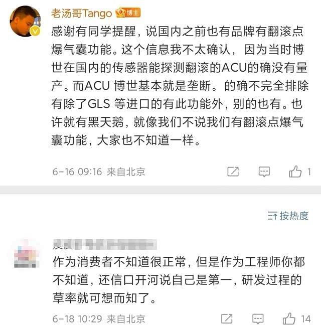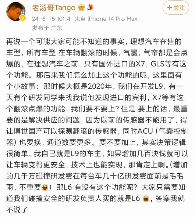 前两天,平台认证为理想产品线负责人的博主“老汤哥Tango”在平台发文称:说一个可能大家不知道的事实,理想汽车在售的所有车型,在车辆翻滚的时候,气囊气垫都是会点爆的,而在理想之前只有国外进口的X7和GLS等级的汽车才有这个功能。