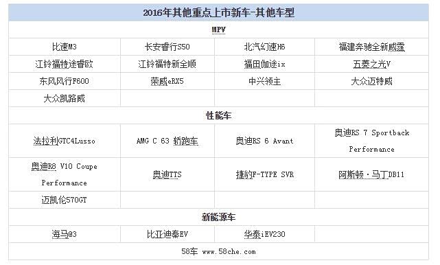 除了轿车及SUV领域,2016年还有不少MPV,新能源车以及性能车上市。不过这些新车在市场中并不是主销产品,更多的是填补市场空白以及提升品牌形象。