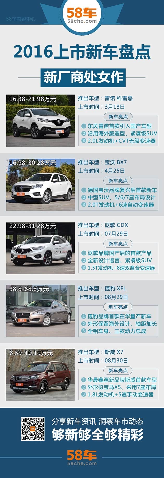 从表格中的新车数量我们不难看出,SUV车型仍然是2016年度各厂商的发力重点,并且半数以上新车都是由自主品牌所贡献。这其中,尤以哈弗H7系列车型表现突出,该系列在上市仅半年之后便达到了月销万辆的量级。另外,北汽B级80车型也以29.8万元的售价刷新了今年自主品牌SUV车型的售价新高。而合资品牌方面,本田冠道、宝马X1、凯迪拉克XT5等车型也是值得重点关注的实力悍将。