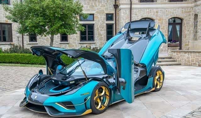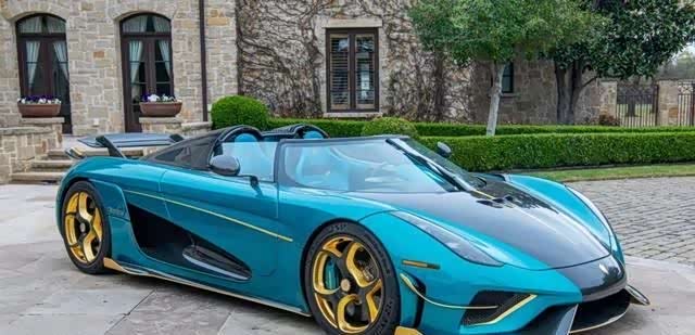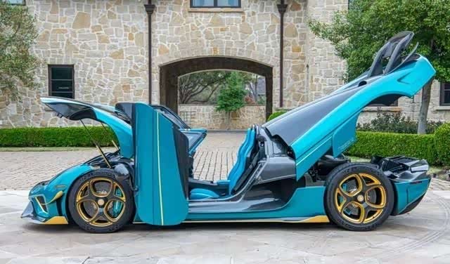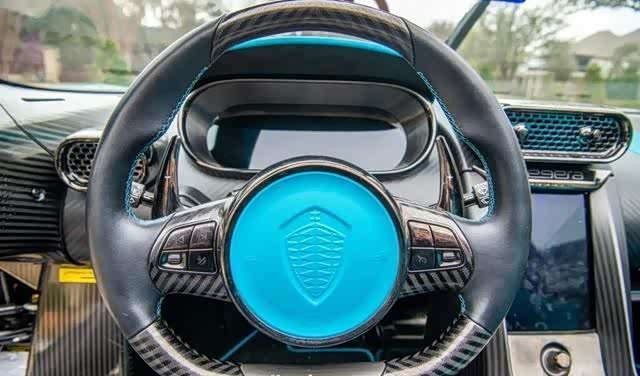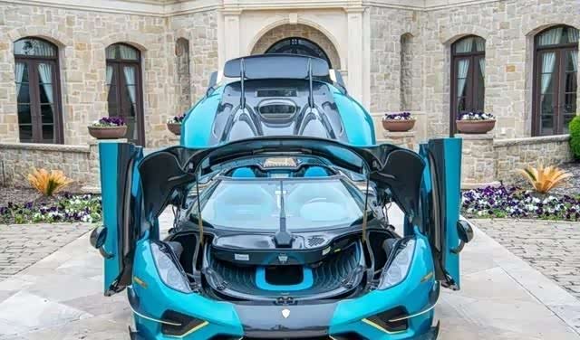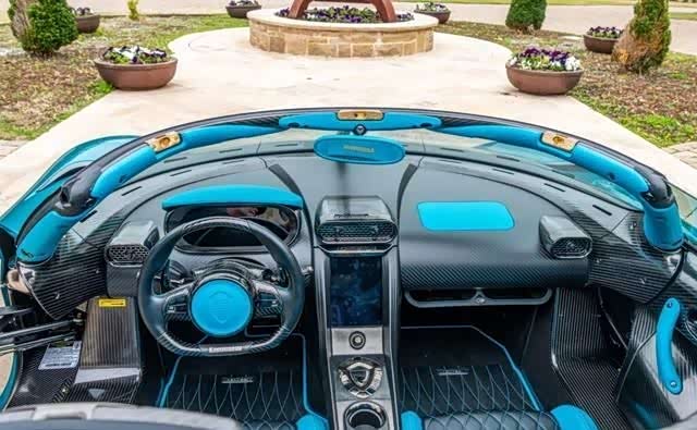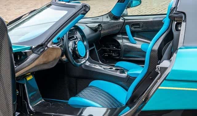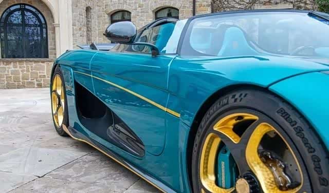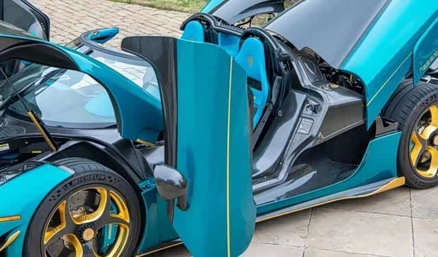 照片里这辆2021年生产的Regera是后期打造的车型,外观上拥有糖果液体态蓝金属漆,带透明涂层的裸露碳纤维,除此之外还使用了大量金箔点缀,使得整个外观看起来极尽奢华。
