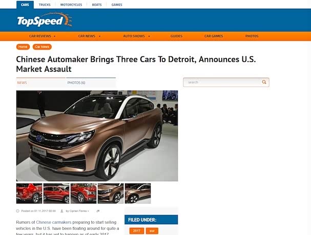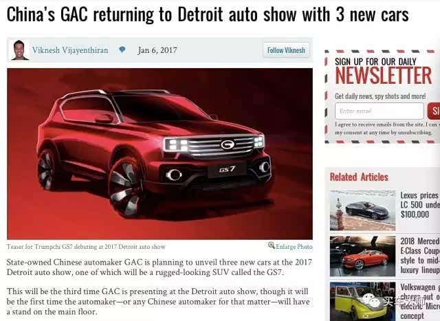 中国厂商方面,广汽传祺是今年唯一参加北美车展的中国汽车品牌。TopSpeed、底特律新闻等媒体都在显著位置对广汽传祺进行了报道,评价有质疑、调侃,也不乏肯定。