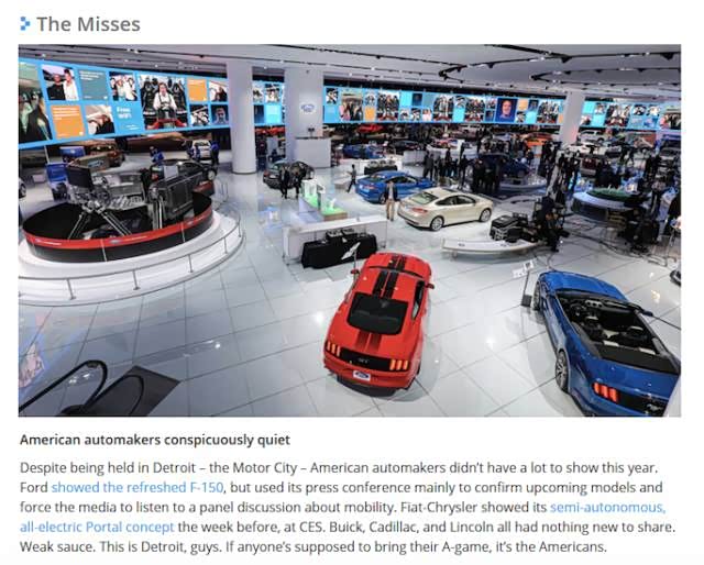 “尽管在底特律举行,但是美国汽车制造商没有太多可展示的。福特展出了新的皮卡F-150,但只在新闻发布会上说会有其他新的车型。菲亚特-克莱斯勒只是展示了电动概念车,林肯、凯迪拉克、别克都没什么可分享的。”
