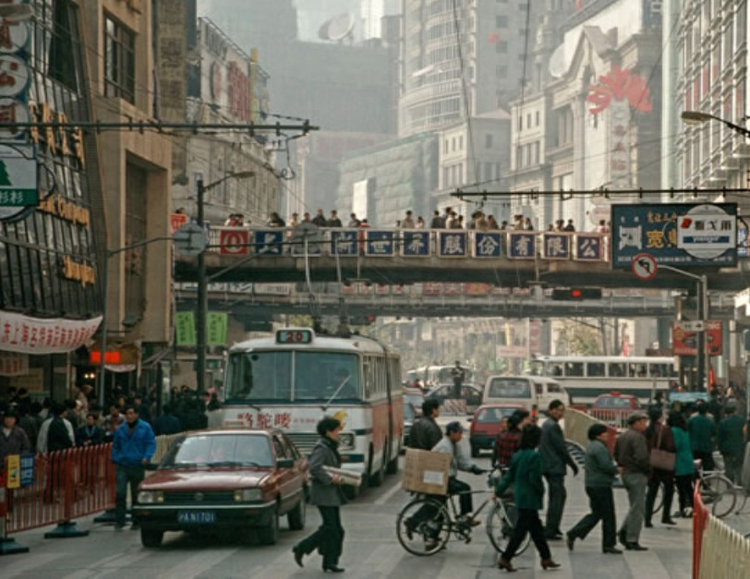 图|步行街改造前的南京东路,照片摄于上世纪九十年代中前期,主义右侧远处的夏利两厢出租车