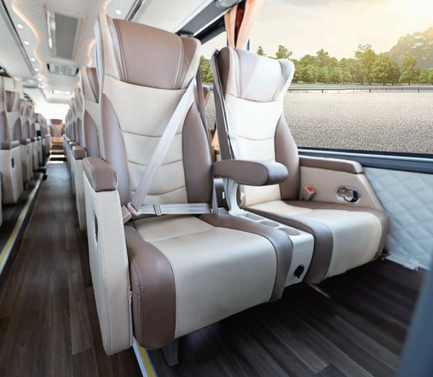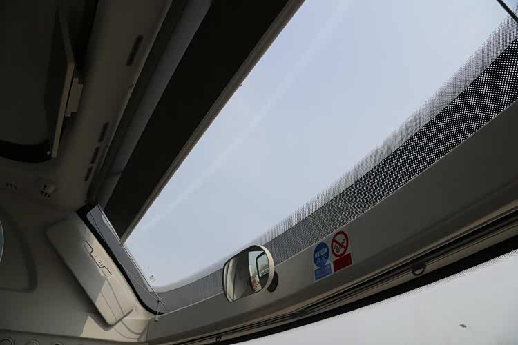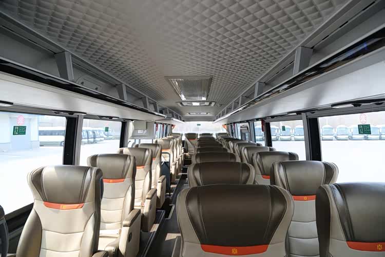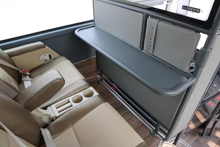 内饰根据用户需求有多种配置和布局可供选择,通过升级工艺、优化空间,为乘员创造居家式的温馨乘车氛围。拍摄车座椅全部采用真皮饰面,切实提升了高端感和豪华感。头枕左右进行了加宽,并配备独立安全带,保障舒适性和安全性。逃生门处的座椅采用折叠坐垫,让出关键的逃生空间。座椅上方设计有行李架,供乘客放置随身行李。