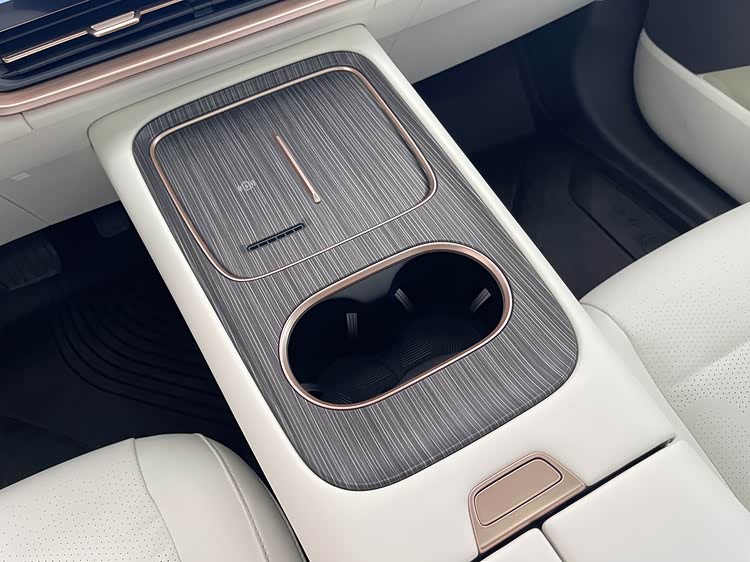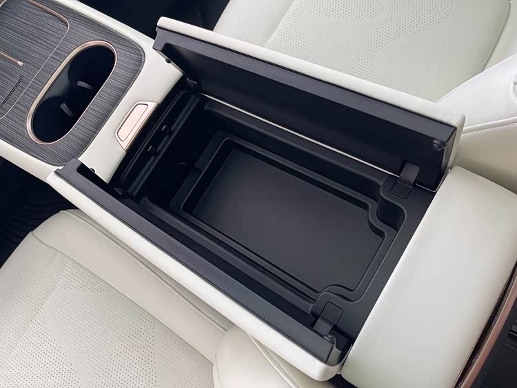 中央扶手这块还是挺精致的,能看到一块深色的木纹饰板,手机放置区域的左边部分支持无线充电,功率达到50瓦,并支持主动散热。