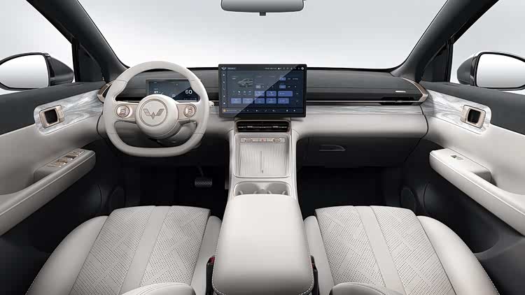 车内采用环抱式座舱设计,中控台上配有一块悬浮式的液晶仪表盘和悬浮式的中控屏,车机配备了智能化的语音控制和多种App。