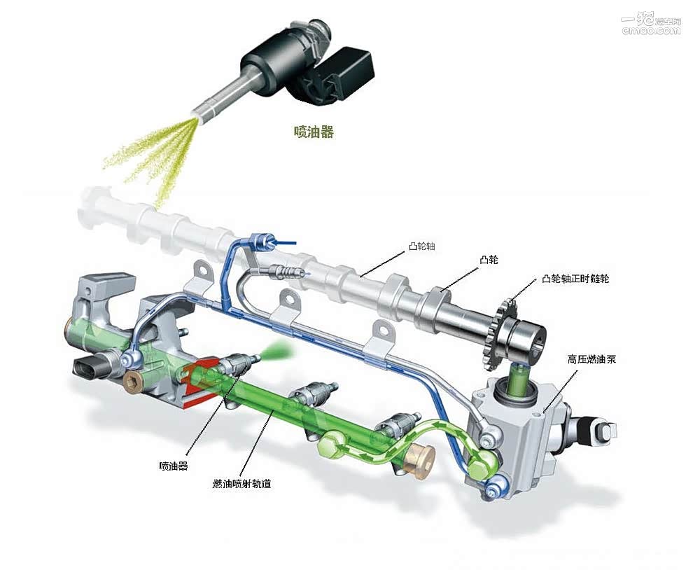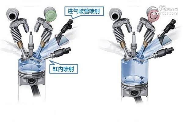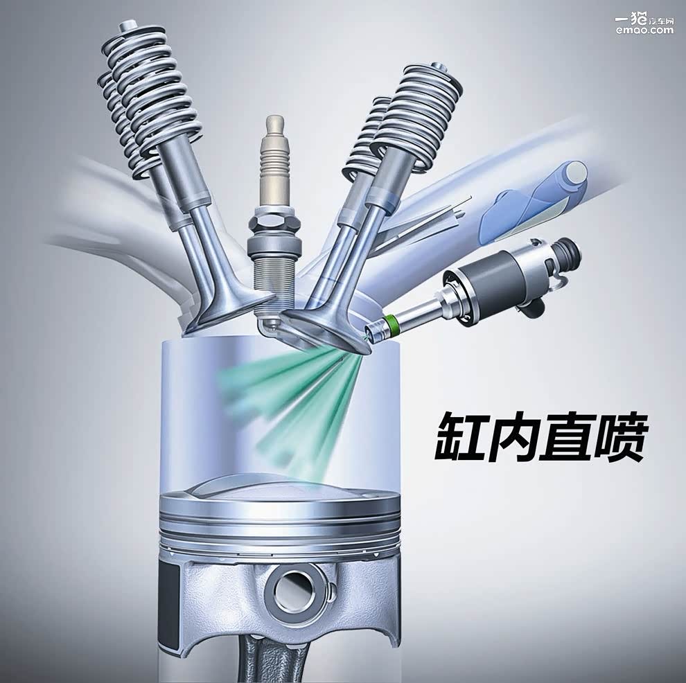 缸内直喷就是将燃油喷嘴安装于气缸内,直接将燃油喷入气缸内与进气混合,喷射压力也进一步提高,使燃油雾化更加细致,真正实现了精准的按比例控制燃油和进气混合,消除了以往进气歧管在缸外喷射的缺点。同时,喷嘴位置、喷雾形状、进气气流控制以及活塞顶形状等特别设计使油气能够在整个气缸内充分、均匀的混合从而使燃油充分燃烧,能量转化效率更高。