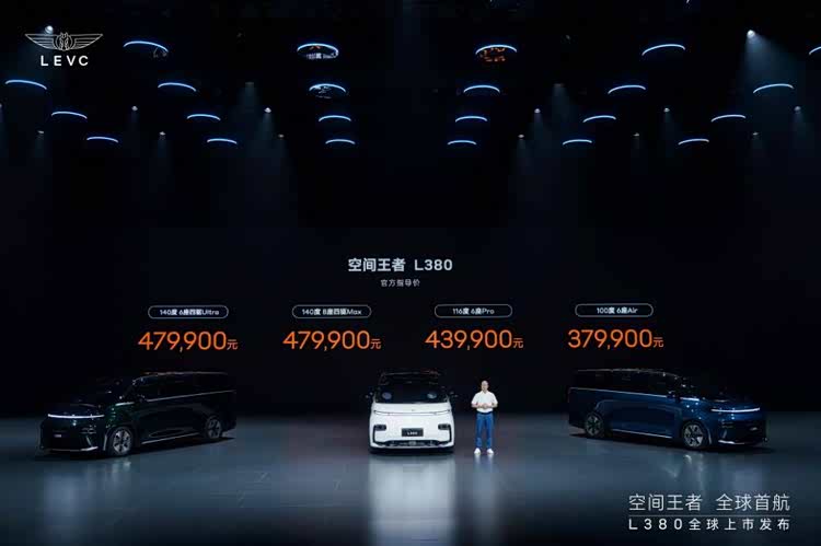 L380共推出100度电6座Air版、116度电6座Pro版、140度电8座四驱Max版及140度电6座四驱Ultra版4款车型,官方指导价37.99万元-47.99万元。