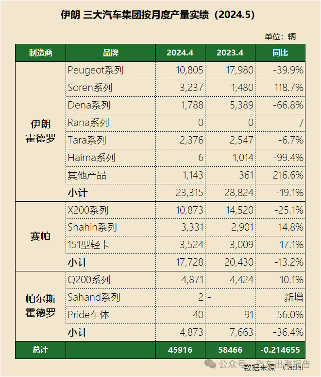 车家号·0浏览·2024-06-26 14:12 · 上海2024年4月份(波斯历1403年1月),伊朗主要集团的乘用车与轻型商用车(主要为皮卡)的产量出现明显下降。占据伊朗市场90%-95%市场份额的伊朗霍德罗(Iran Khodro)、赛帕(Saipa)和帕尔斯•霍德罗(Pars Khodro,赛帕的子公司)三大汽车集团的产量为58,466辆相比,减少了21%。