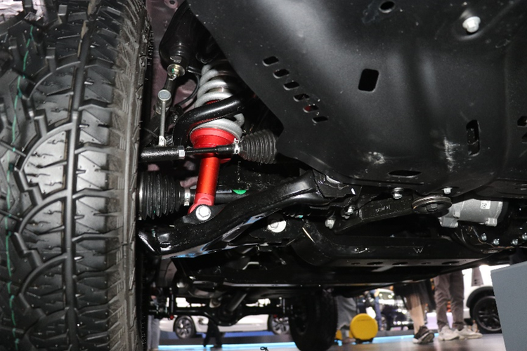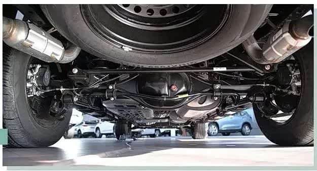 皮卡车身结构特点在空载时货箱部位较轻会产生弹跳,螺旋弹簧配以多连杆结构的后悬架可以将车辆经过不平路面时产生的弹跳吸收和释放,减少车辆弹跳的幅度,使车轮尽可能的与路面保持接触,从而最大限度的增加车辆的舒适性。